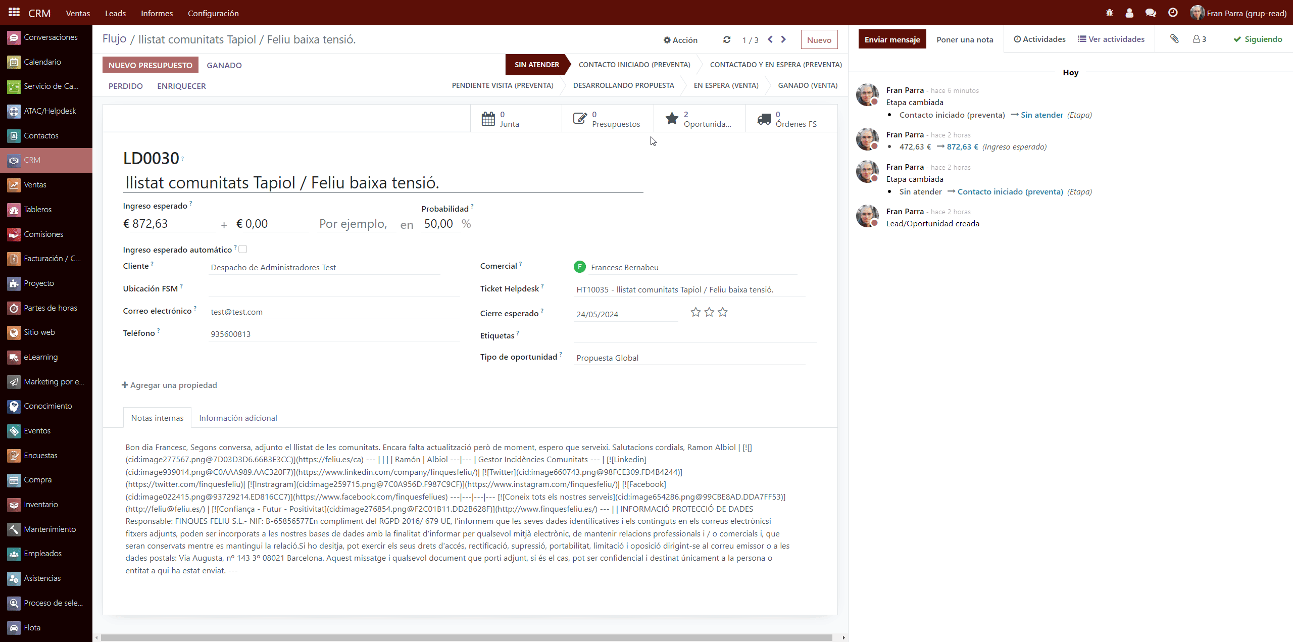 Desde esta misma vista se puede hacer una gestión más eficiente de todas las actividades e incluso mandar correos sin necesidad de entrar en la oportunidad.