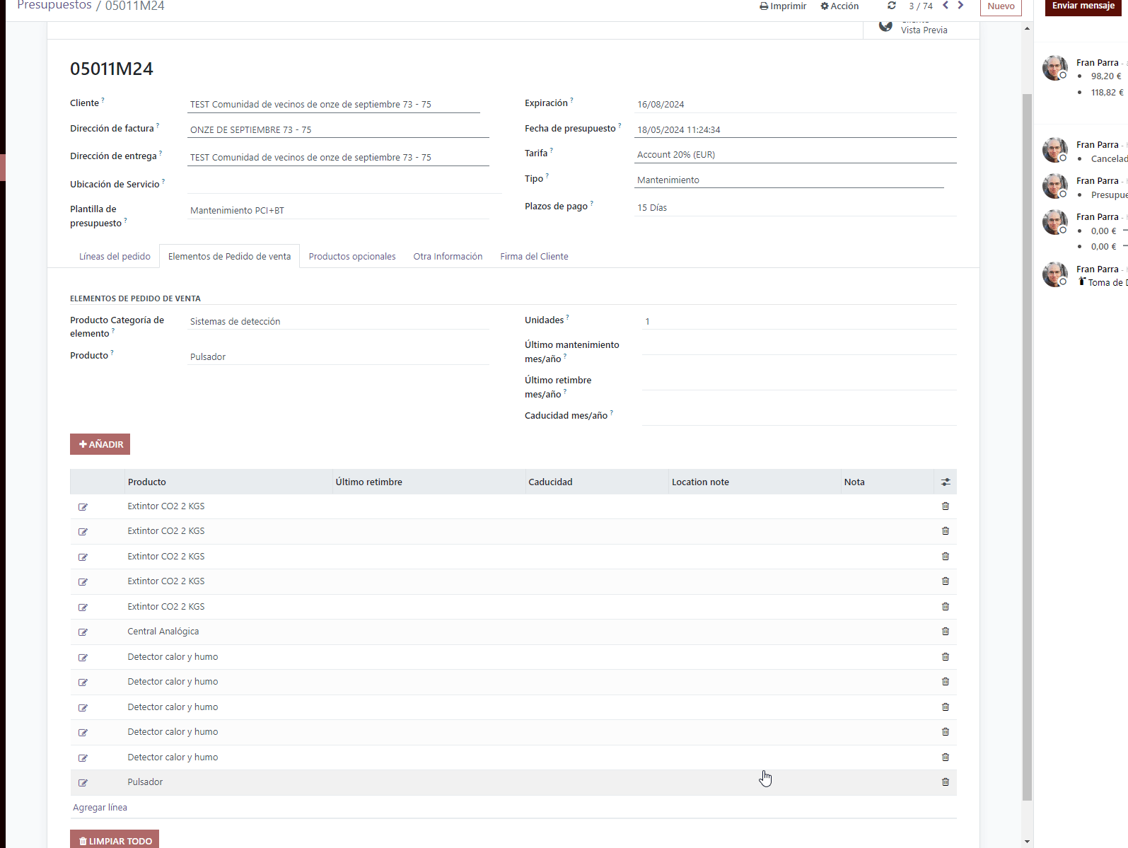 A continuación veremos el ejemplo de un presupuesto de Mantenimiento, a partir de los elementos que se hayan introducido en la toma de datos se determinan las revisiones (mantenimientos) necesarios para cada elemento y se recupera el precio asignado en la tarifa del cliente en cuestión.